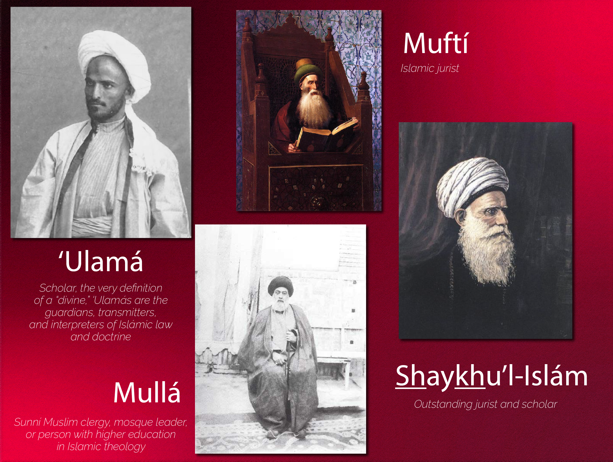 Collage of a variety of different Muslim clerics: a ‘ulamá, a mullá, a muftí, and a Shaykhu'l-Islám. © Violetta Zein